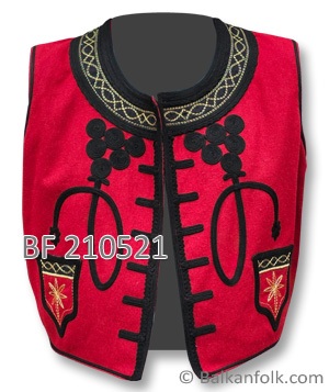 Червен тракийски мъжки елек с апликация от черно кадифе и гайтан. Елека е изработен от вълнен плат с хастар по автентичен обазец от Ямбол.