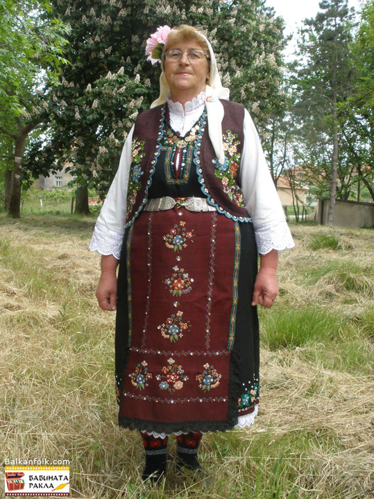 Празнична носия от с.Сива река,Свиленградско,сукман с везана шевица на полата и пазвата,кенарена риза с дантела на ръкавите,везан елек,престилка-скутник,бродирана кърпа-меркезе,плетени чорапи,колан-сребърен от пафти.