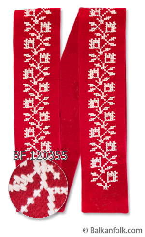 Червен бродиран вълнен пояс от женска шопска носия от Софийско изработен в ателието за народни носии на Балканфолк. Размери: 100 х 8 см