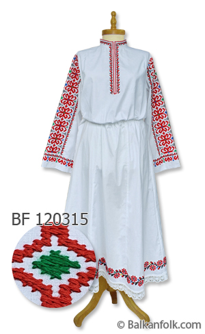 Женската шопска риза е изработена от бял памучен плат с традиционна българска бродерия на пазвата, яката, ръкавите и полата.