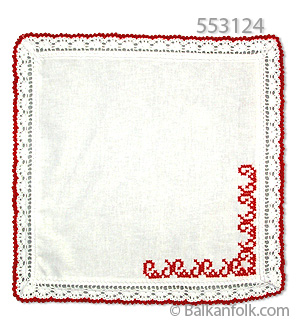 Бродирана памучна кърпа с оплетена с червено дантела. Бродерията е характерна за шопската фолклорна област. Нов код BF 821403.