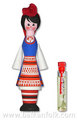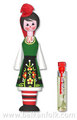 BF 053302 Muskal - doll girl 2 A small Bulgarian wooden traditional doll souvenir in a typical Bulgarian folk costume. It contains inside an ampoule of the famous Bulgarian rose oil essence (2,1 ml), which is the main product in perfumery.