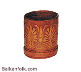 Pork leather pencil box with cylindrical shape made manually under a special technology. Decorated with typical oriental and Bulgarian ornaments. Size: 8.5x10 cm