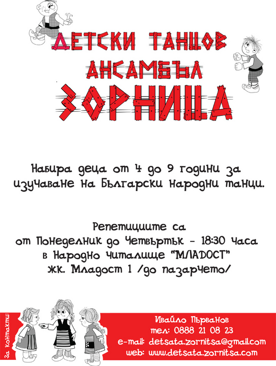 For more information on the use of children in the ensemble can contact his manager Ivaylo Parvanov - 0888 210823 or the website detsata.zornitsa.com.